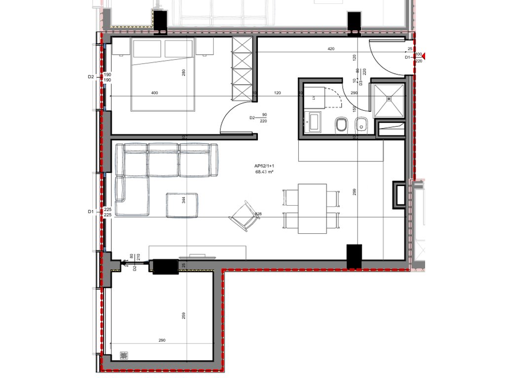 Apartment 1+1 for sale, with a net area of 68.43 m2 (gross 77.8 m2), 8th floor, with south-west orientation. It is organized by living room + kitchen + dining room, bedroom, bathroom and balcony.